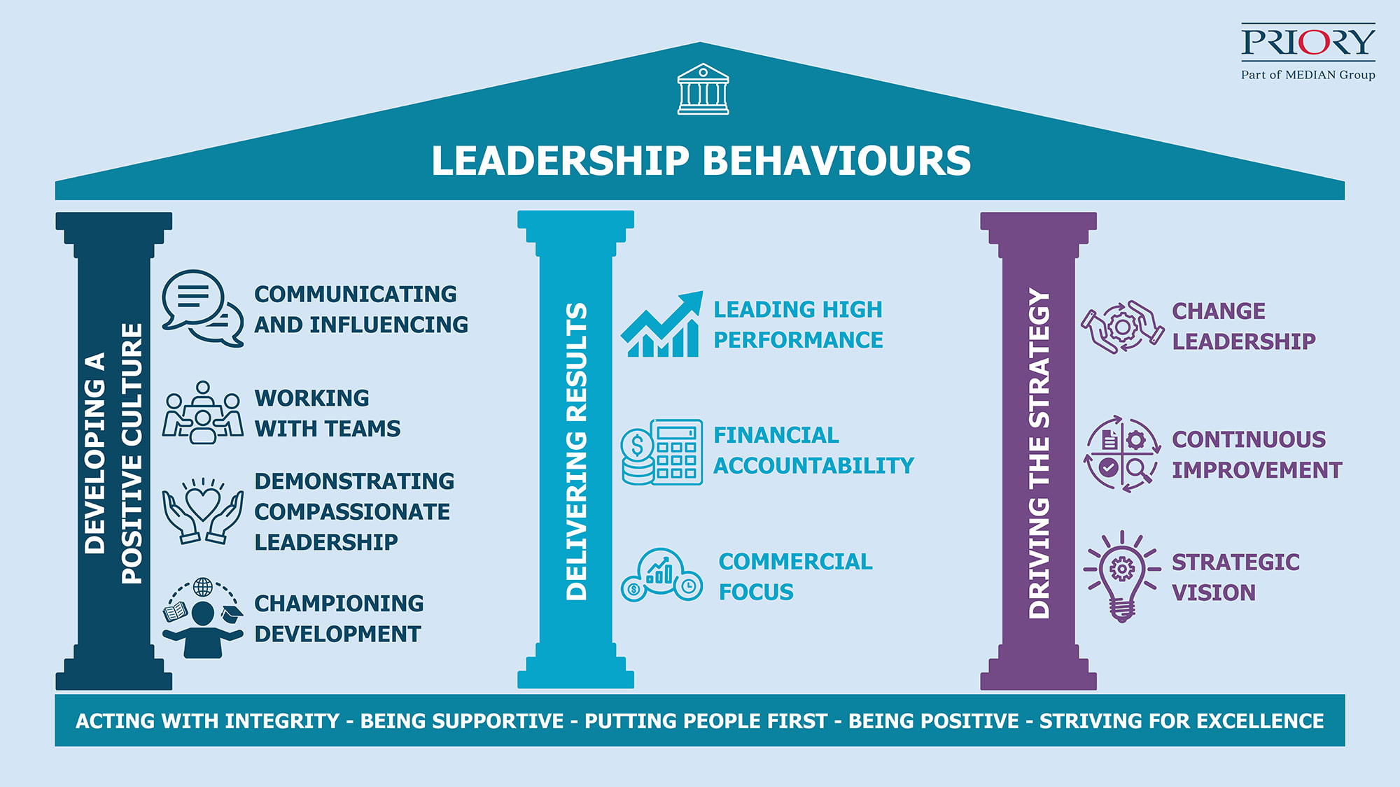 Leadership roles are typically a two stage interview process where we will be assessing you against our leadership behaviours. These are a values-driven set of key behaviours that defines what great leadership looks like at Priory - shown in this graphic.